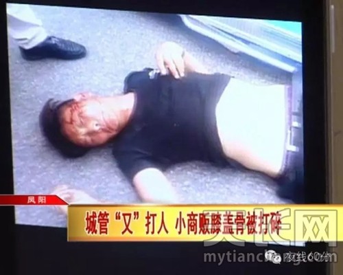 小贩被打时画面截图 近日,凤阳县的李炳雨女士给记者打来电话称:她和丈夫在凤阳摆摊卖早点,6月23号早上,当地城管前来执法,在执法的过程中,城管与夫妻俩发生冲突,导致李炳雨的丈夫膝盖骨被城管工作 ...