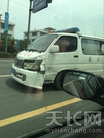 刚才西城区天康大道与经四路口处一辆SUV与120救护车发生碰撞。SUV车头受损严重。希望各位司机一定要谨慎驾驶。