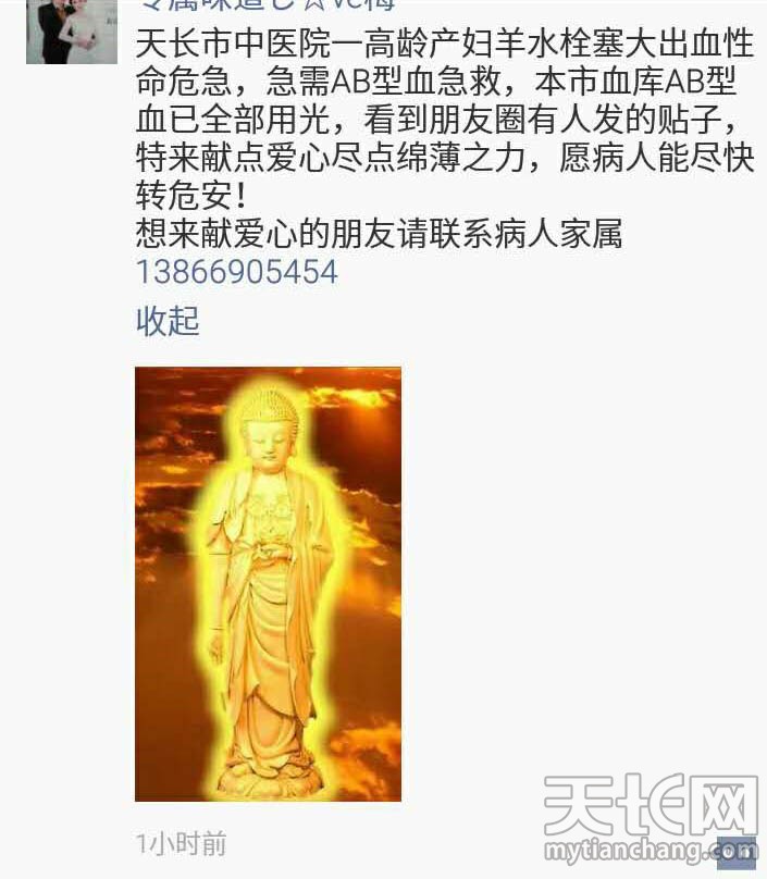 今天朋友圈被刷爆了,都在呼吁帮助这个人。我掐指一算,我就是AB型的啊,虽说我们是万能接收型血型,但献血还是匹配优先。打过去一看,已经够了(我打的不是这个号码),看来我们大天长好人还是很多的呢。