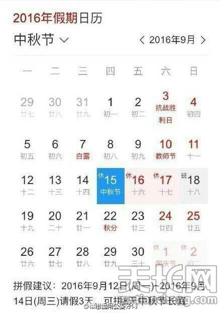 今年的中秋节放假安排为9月15日(星期四,中秋节)至17日(星期六)放假调休,共3天,9月18日(星期日)上班。值得注意的是,中秋节放假期间高速公路通行并不免费。请合理规划假期,避免拥堵安全出行!