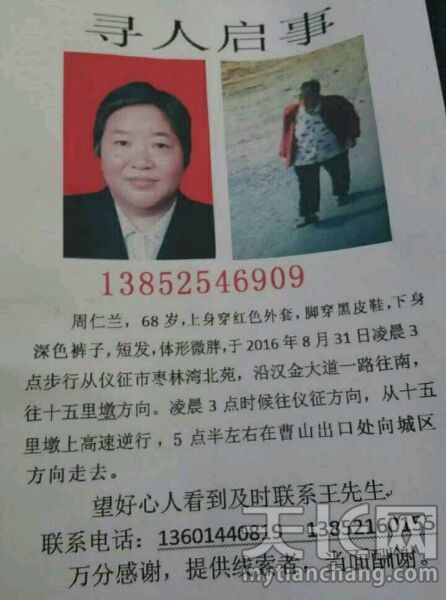 仪征一走失老太朝安徽天长方向去了希望好心人能够帮忙