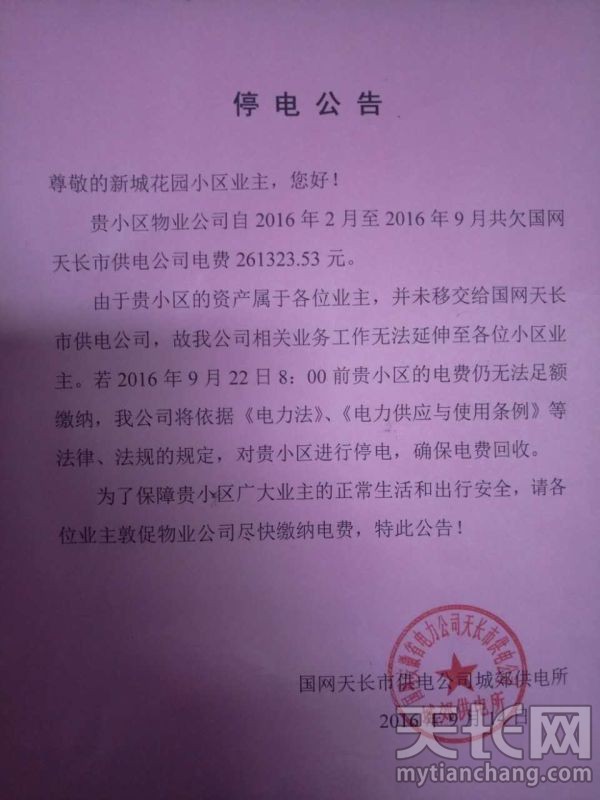 客户您好! 《电力供应与使用条例》第三十九条规定:逾期未交付电费的,自逾期之日起计算超过30日,经催交仍未交付电费的,供电企业可以按照国家规定的程序停止停电。 《供电营业规则》第六十七条规定:供电企业需对用户停止供电时,需在停电前三至七天内,将停电通知书送达用户。 “新城花园”小区属安徽天缘房地产开发集团有限公司管理,小区属自管性质。小区内客户由小区自备变压器供电,线路设备产权归物业公司或小区开发商所有,天长供电公司按照合同约定和安徽省物价局规定电价收取小区总表电费,供电公司与小区低压用户无直接供用电关系。 该用户自2016年2月至2016年9月共欠电费261323.53元,拖欠电费金额巨大,对我公司的电费回收工作带来了严重的影响。虽我公司每月上门、电话催缴,但小区仍未及时缴纳电费。供电公司严格按照国家相关规定,欠费停电前已采取以下措施: 1. 9月13日将停电通书送交该小区物业公司(物业经理已签收)。 2. 9月14日在小区各个楼梯口、宣传栏及显著地方张贴停电公告。 3. 9月15日前将停电通知书送达该小区门面房业主并由业主签字,因业主不在家导致未送达成功的门面房,工作人员已将停电通知书在附近墙面上张贴并拍照留存。 4. 9月18日与小区业主委员会联系,告知小区欠费情况及公司即将采取的措施。 5. 9月18日国网天长市供电公司发函天长市国土资源和房产管理局物业股,告知小区欠费情况及公司即将采取的措施。 供电公司身为服务型企业,供好电、多供电是我们的宗旨,采取停电措施也是企业的无奈之举。尊敬的客户,为保障贵小区广大业主的正常生活和出行安全,请各位业主敦促物业公司尽快缴纳电费。 关于小区移交业务,解释如下: 客户电力资产移交应遵循客户自愿、资料齐全、协商一致的原则,如小区住户需要由供电公司销售、抄表、收费、服务到户,需由小区产权单位按照安徽省住建厅下发的《城市居住区供配电系统技术规范》相关规定,向供电公司申请小区一户一表改造。 根据相关规定:供电公司接到客户有关电力资产无偿移交的书面申请及移交设备清单后,5个工作日内按照供电方案对设备清单进行现场核对,检查用户申请移交资产范围、质量是否符合电网安全要求;10个工作日内对需整改部分提出书面整改意见,直至合格后在电力资产无偿移交交付清单上签字确认;配电设备资产经技术评价及安全性评价合格并签字确认后3个工作日内,经公司相关部门及领导审核批准后生效。 |