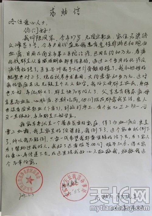 大家好,我叫陆凤军,今天37岁,无固定职业,家住石梁路文峰巷3号。今年8月份查出我患有急性非淋巴细胞白血病,目前在南京市第二医院治疗,现已花费40万元,看病的钱都是从亲 ...