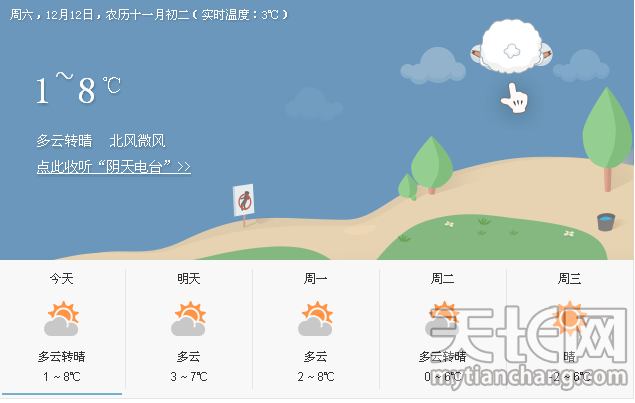 今天多云转晴,偏北风3级左右,最高气温1-8℃,明晨最低气温3-7℃;预计13-14日以多云为主,15日多云转晴;近期多雾霾,出行请注意交通安全。