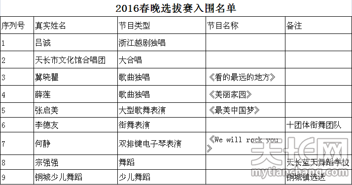 2016天长市春晚选拔赛于1月10日、11日举行。现将入围的名单公布如下: