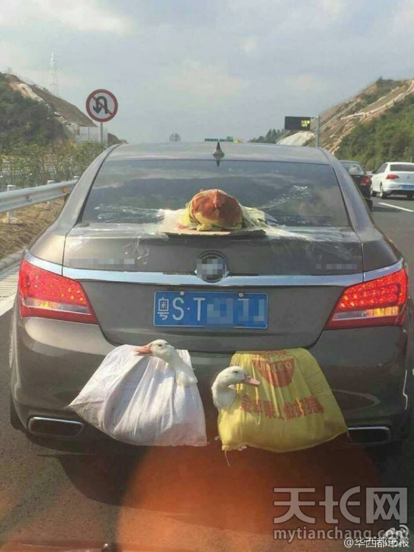 春节长假即将结束,父母用心良苦,什么东西都让子女带着,连家里的鸡鸭都不放过,13日,网友微博上爆料,高速路上遇到一辆极具喜感的画面:一辆轿车的车尾吊着两只鸭,后盖上还趴着一只鸡 ...